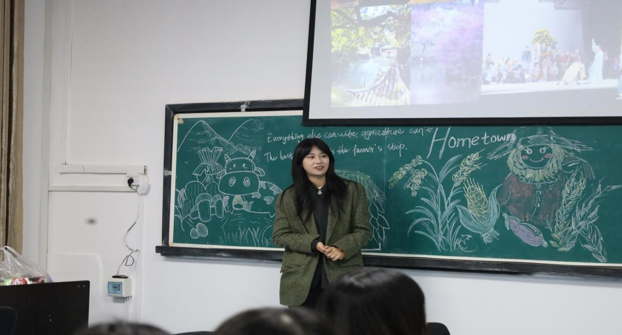 分享展示环节精彩纷呈,同学们依次登台分享家乡风物。有同学介绍宜春袁州作为“中国油茶之乡”的特色,讲述油茶的营养价值与“东方橄榄油”的美誉,展现油茶产业对家乡发展与乡村振兴的重要意义;有同学介绍江苏扬州的莲藕淀粉与高邮双黄咸鸭蛋,用流利英语呈现江南水乡的物产风情。